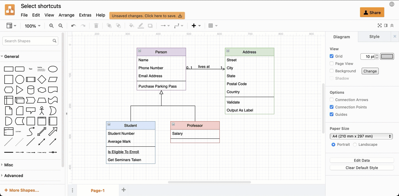 Keyboard shortcuts in draw.io (and the draw.io apps developed by JGraph) enable you work with shapes and connectors in your diagrams both easier and faster. There are a number of ways you can select shapes and connectors with the keyboard, or when holding down a key and using the mouse.